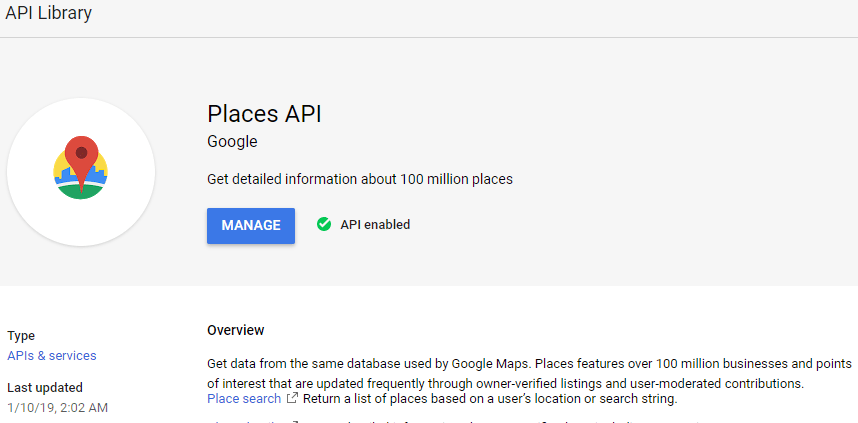 After successfully create api key , Click on top google dashboard search bar and search Place API and Enable the Places API.