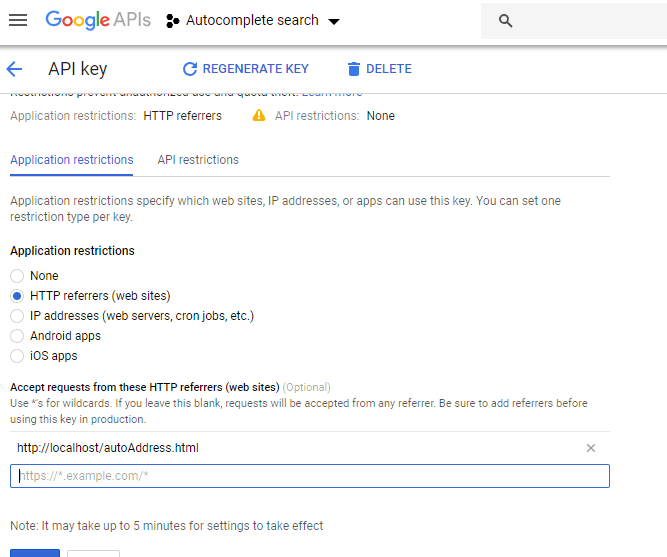 Then set HTTP Referrers like http://localhost/autoAddress.html , look like this picture :